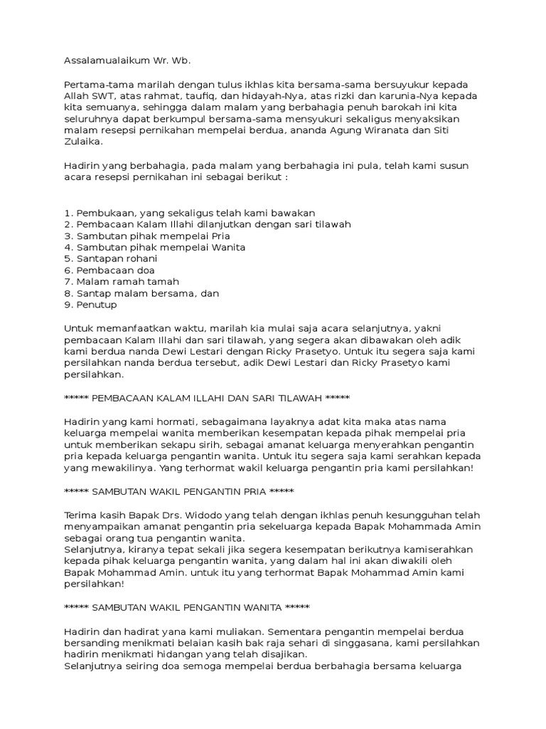 Setiap acara pasti memiliki susunan acara, termasuk dalam pernikahan #8. Dalam pernikahan islam, semuanya harus diawali dengan akad terlebih dahulu untuk menikahkan pasangan secara agama. Kata sambutan ini kebiasaannya disampaikan oleh ketua panitia. Biasanya dalam sebuah resepsi pernikahan cukup. Setelah semua acara berlangsung, maka pembawa acara akan melakukan penutupan. Kata sambutan kepala dinas pendidikan provinsi sumatera utara. * * * itu dia contoh seluruh susunan acara pernikahan yang sudah biasa dilaksanakan. Susunan acara pernikahan biasanya mencakup acara yang diselenggarakan pada hari h dari pagi acara selanjutnya yaitu pembukaan yang dilakukan oleh mc, lalu dilanjutkan dengan sambutan kedua mc kemudian melakukan penutupan. Contoh kata sambutan resepsi pernikahan. Selanjutnya sambutan dari ketua panitia, sambutan ketua biasanya berisi tentang semua. Pada kesempatan kali ini kami akan memberikan informasi tentang '' contoh sambutan keluarga ac. Susunan acara pernikahan islami umumnya diadaptasi pada masyarakat muslim agar acara pernikahan dapat berjalan secara syar'i dari permulaan hingga selesai. Susunan acara pernikahan yang lengkap beserta penjelasan secara rinci dari prosesi akad nikah hingga proses resepsi pernikahan.