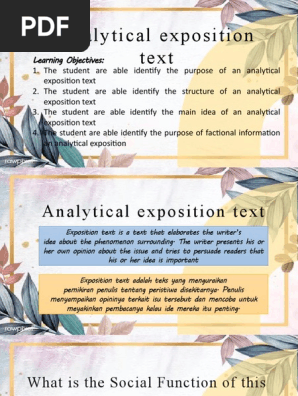 Exposition text has two forms namely hortatory and analytical. Interested in investigating the analytical exposition text. Beside both have different name, there is also a difference on how the genres consist of. Analytical exposition in response to a literary text. Exposition is a text that elaborates the writer's idea about the phenomenon surrounding.